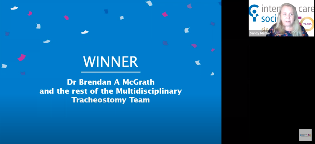 Brendan McGrath, Consultant Anaesthetist at MFT, Honorary Senior Lecturer DIIRM and the NHS England National Clinical Advisor for Tracheostomy, and the team have led on local and national studies identifying recurrent problems with tracheostomy care. The awards were announced online by ICS President and recent OBE recipient Ganesh Suntharalingham and the ICS team.