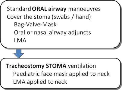 The patient may still need airway opening manoeuvres to maintain a patent airway. Continue the ABCDE assessment. If the breathing is inadequate, ventilation may need to be supported using basic oxygenation methods via the face or stoma.