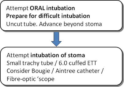 Again, your area of expertise and patient factors will dictate where to start. An established surgical stoma may be easier to re-insert than attempting oral intubation. If the patient is conscious, then manipulation of the stoma is likely to be much better tolerated than upper airway manoeuvres.