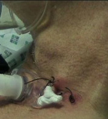 Tracheostomies may be sutured in place after they are first inserted to reduce the risk of early displacement. Again, there is no clear evidence that sutures reduce displacement. These sutures can usually be removed after seven days when the stoma becomes established (Fig 1). Suture scissors need to be available immediately should these tubes require urgent removal.
