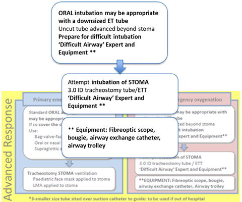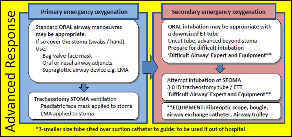 The Advanced response prioritises ways to administer oxygen. This can be to the upper airway or through the stoma. Once a trained assistant attends, the process of intubating the upper airway or stoma can be attempted if safe.