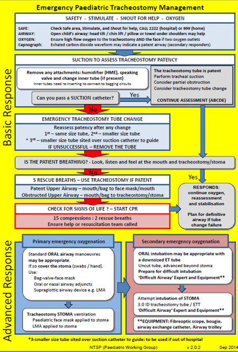 The emergency paediatric tracheostomy management algorithm has been designed to guide responders in an emergency. It starts by addressing the commonest problems which have the easiest solutions and progresses to more complex management. Vital information regarding the child's tracheostomy is always present at the bedside: these bed-heads display information such as tube and suction size but also if the child has a patent upper airway. This is vital as it will guide the use of the algorithm on the reverse of the bed-head.