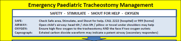 Airway: try to get a position suitable for the child - placing a roll under the shoulders can help to open up the neck and give access to the stoma.