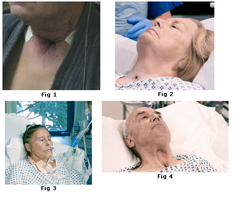 Figs 2 and 3 show tracheostomy stomas, Figs 1 and 4 show laryngectomy stomas.