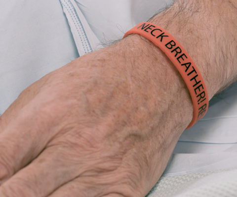 Answer: Medic-alert bracelets are often worn by patients to indicate that they have undergone a laryngectomy (Fig 2). A patient may carry a laryngectomy passport, or if they are in a hospital bed, then they should have a laryngectomy bedhead sign.