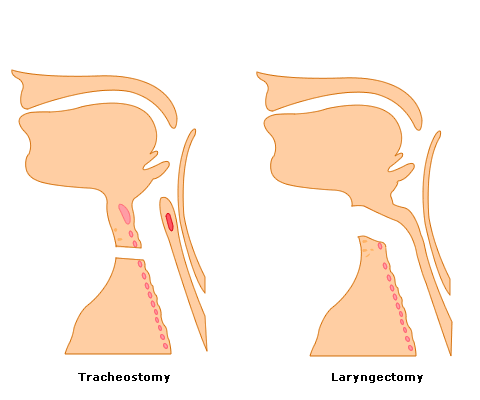 Laryngectomy is the surgical removal of the larynx, usually completely and permanently. The trachea is mobilised and detached from the upper airways, then the open end is stitched to the front of the neck. As a result, there is no connection from the nose or mouth to the lungs.